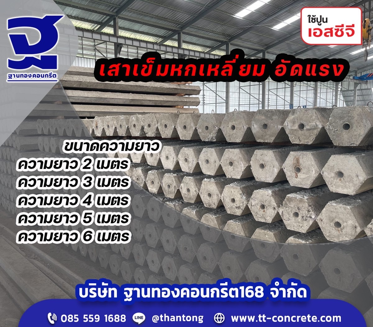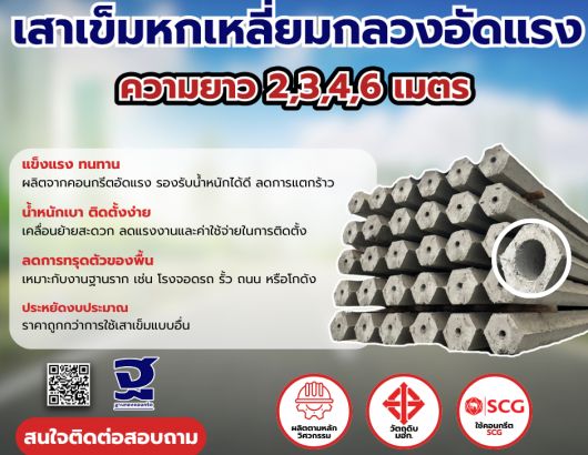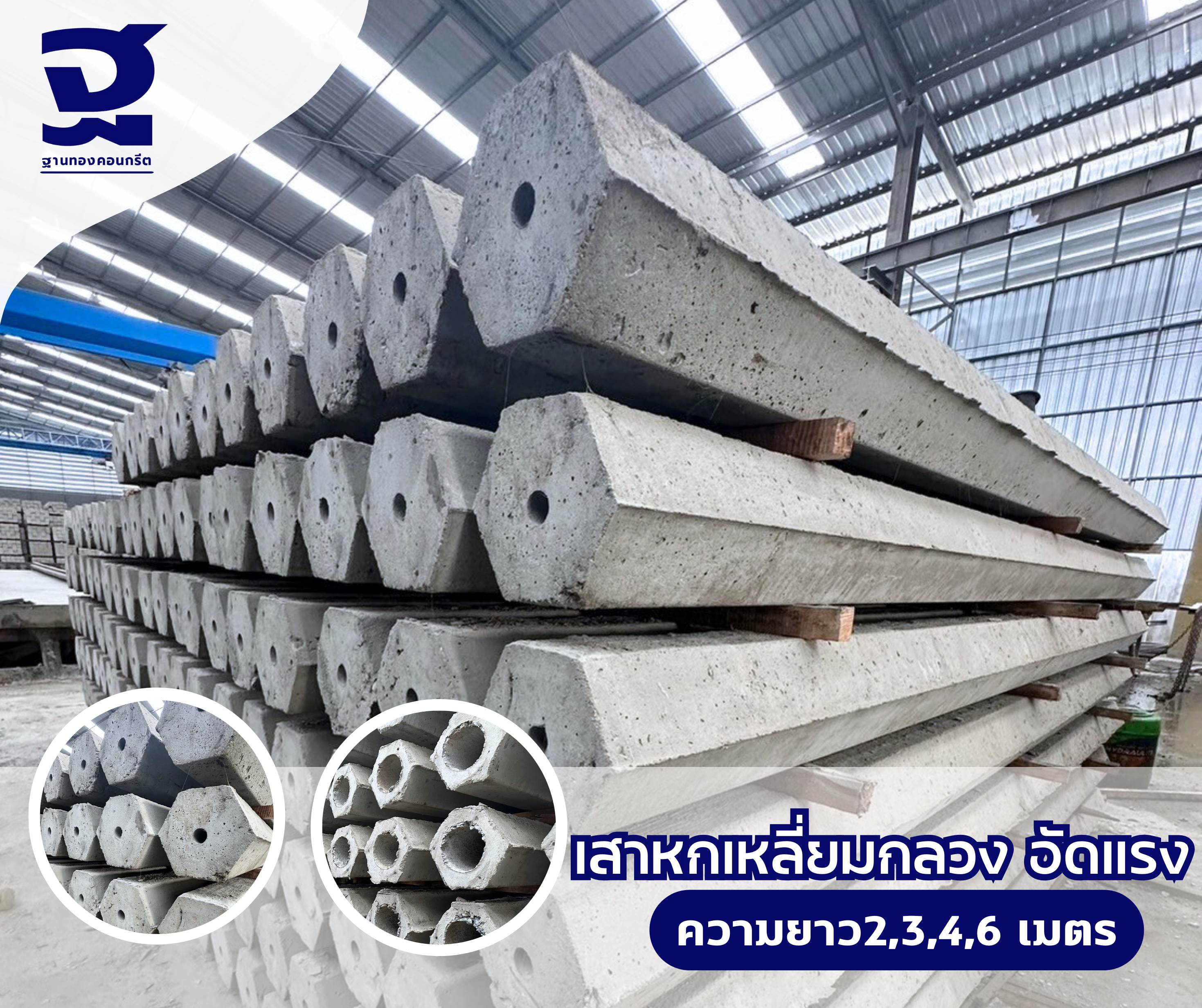 เสาเข็มหกเหลี่ยมกลวง มีขนาดความยาวตั้งแต่ 1-6 เมตร