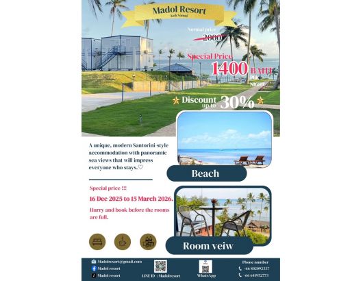 โปรโมชั่น พิเศษ ปีใหม่ (MADOL) มาดลรีสอร์ท เกาะสมุย มาว่ายนํ้า อาบแดด หรือผ่อนคลายและชมวิว พักผ่อนหย่อนใจ โทร. 0641952773