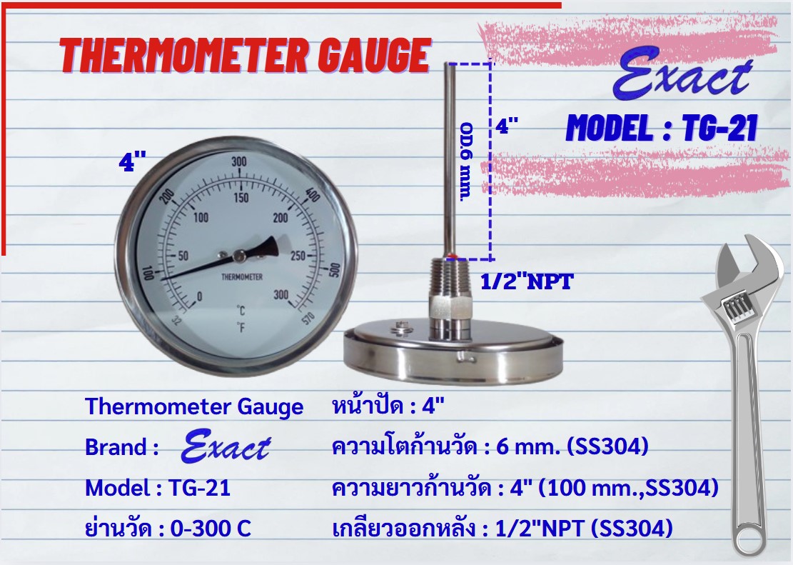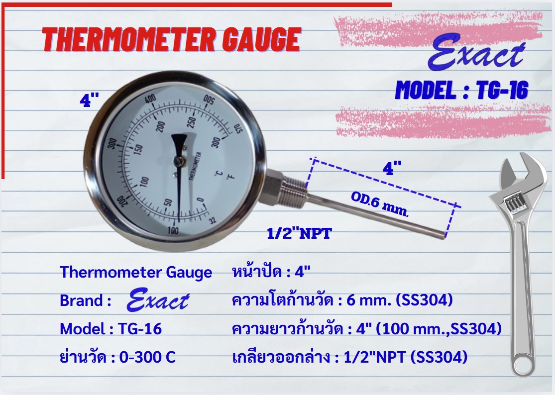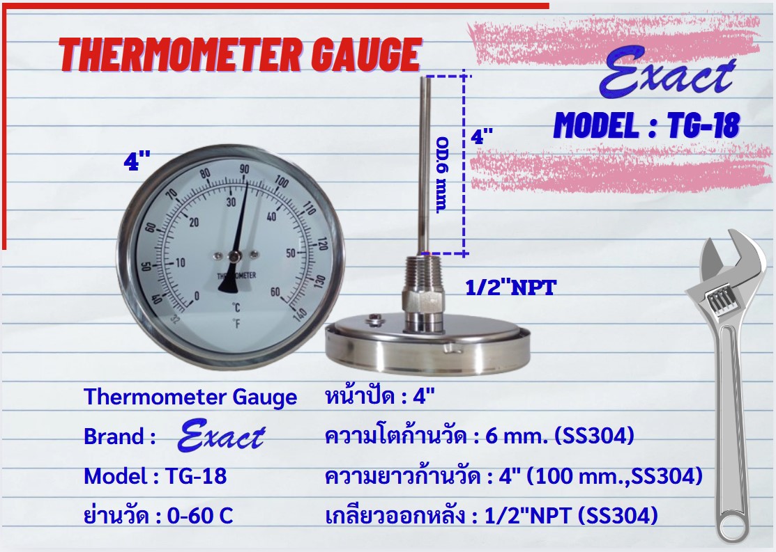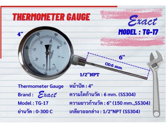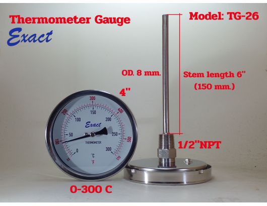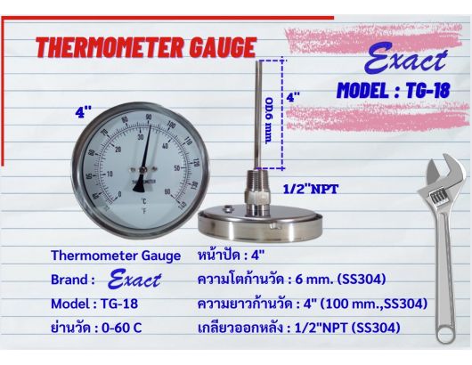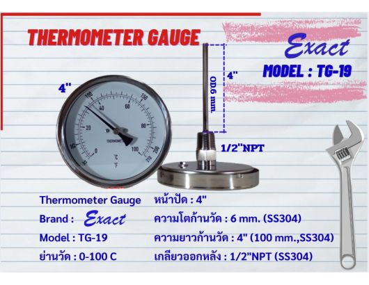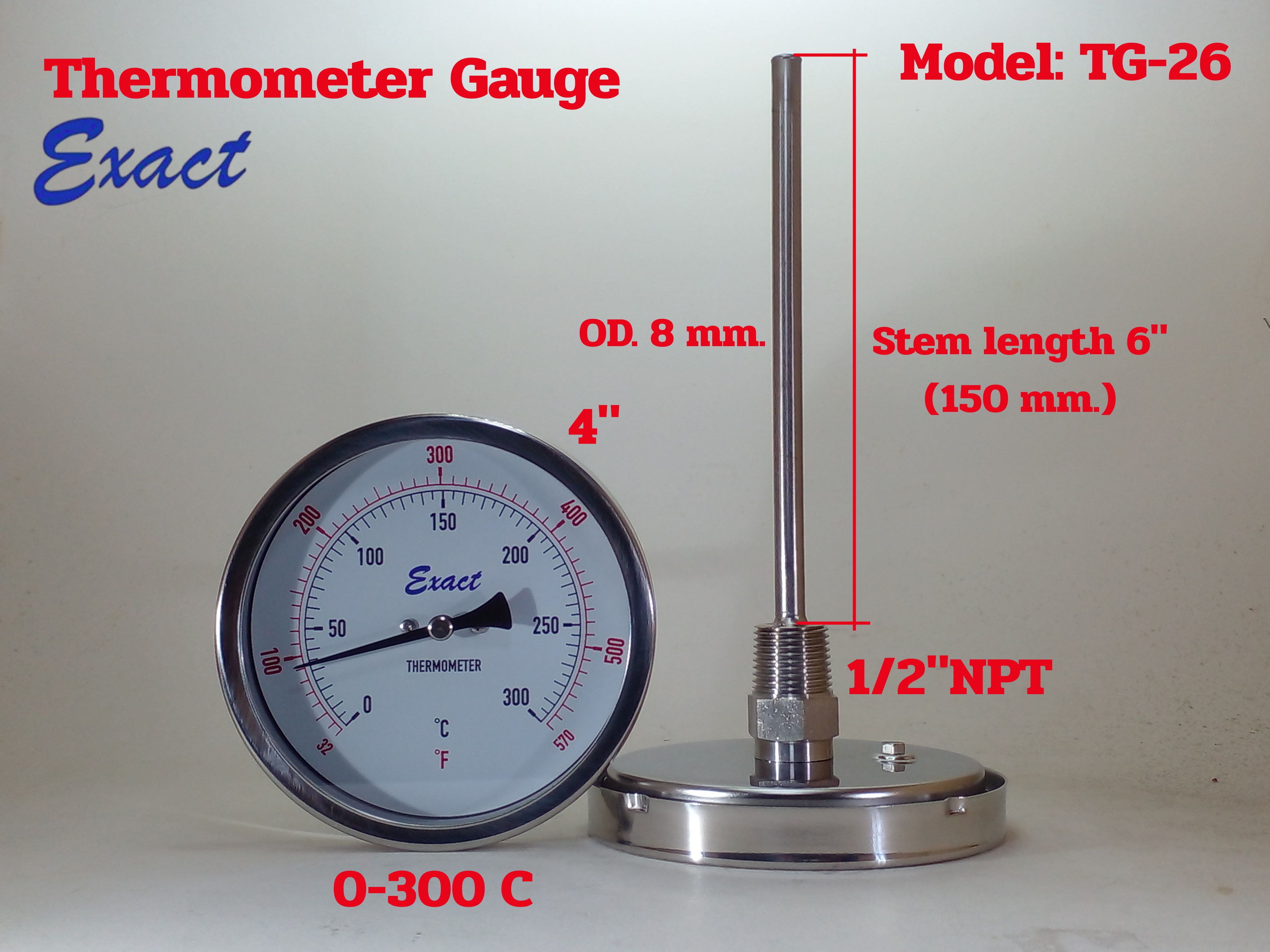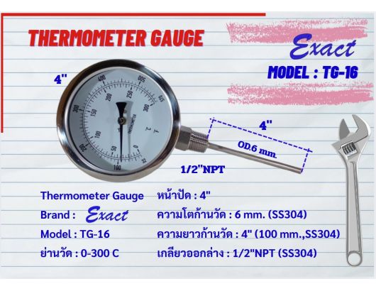 ขนาดหน้าปัด 3”, 4” มีทั้งแบบเกลียวออกหลังและแบบเกลียวออกล่าง ขนาดเกลียว ½” NPT สแตนเลส ความโตของก้านวัดมีขนาด 6 mm. ยาว 2”, 4”