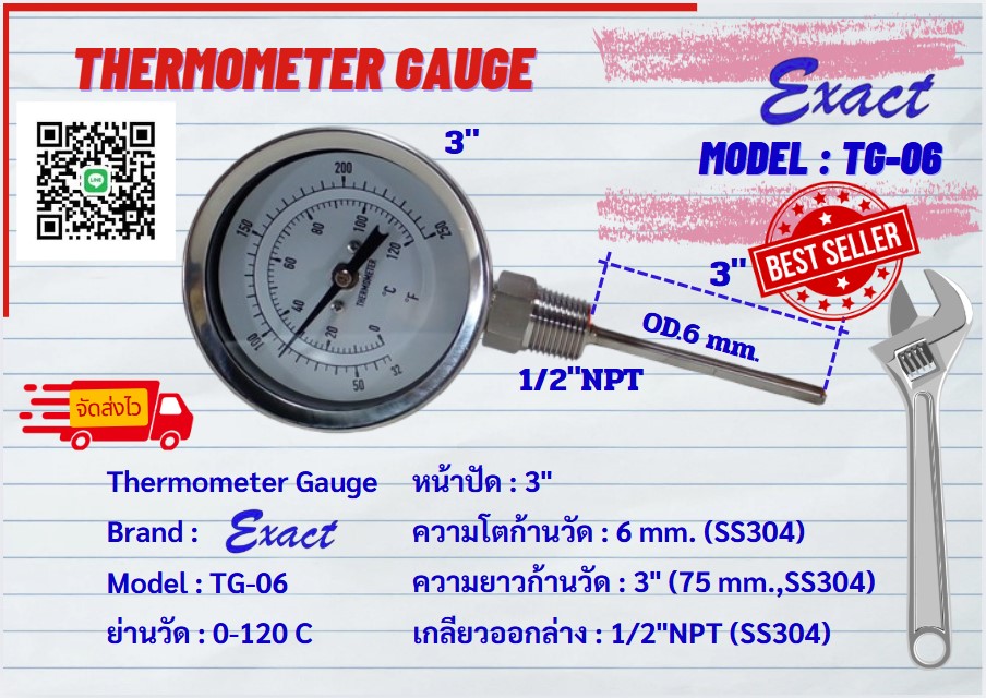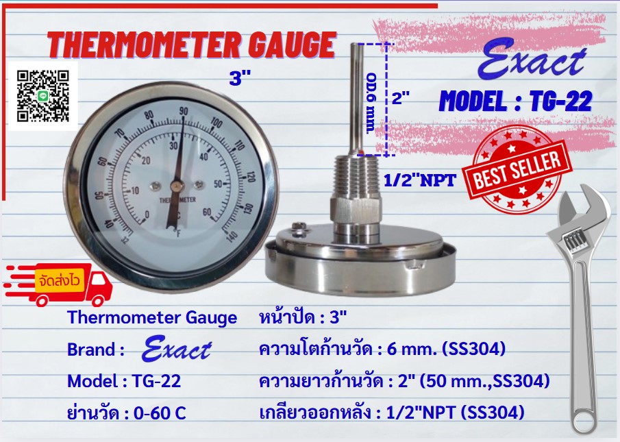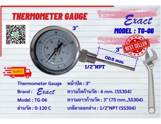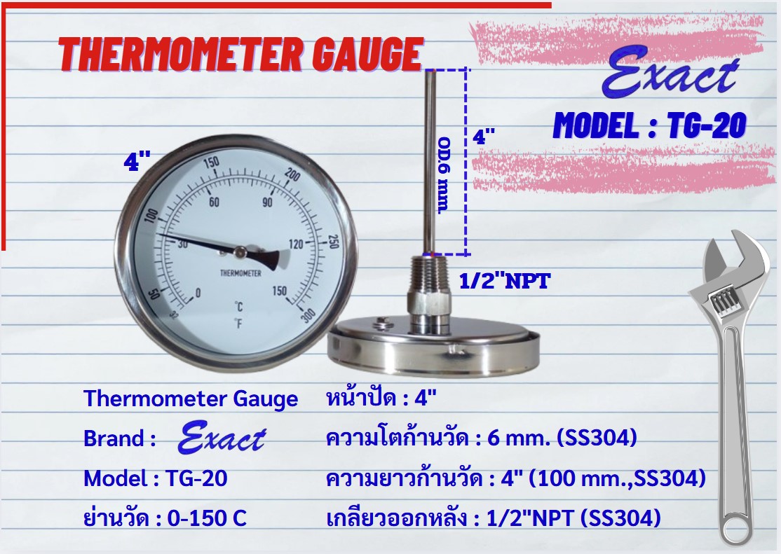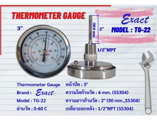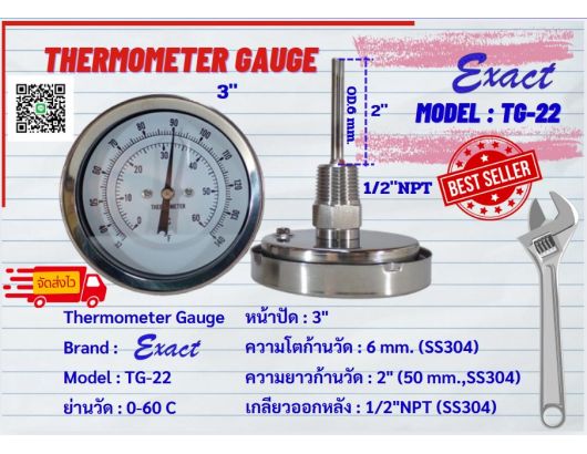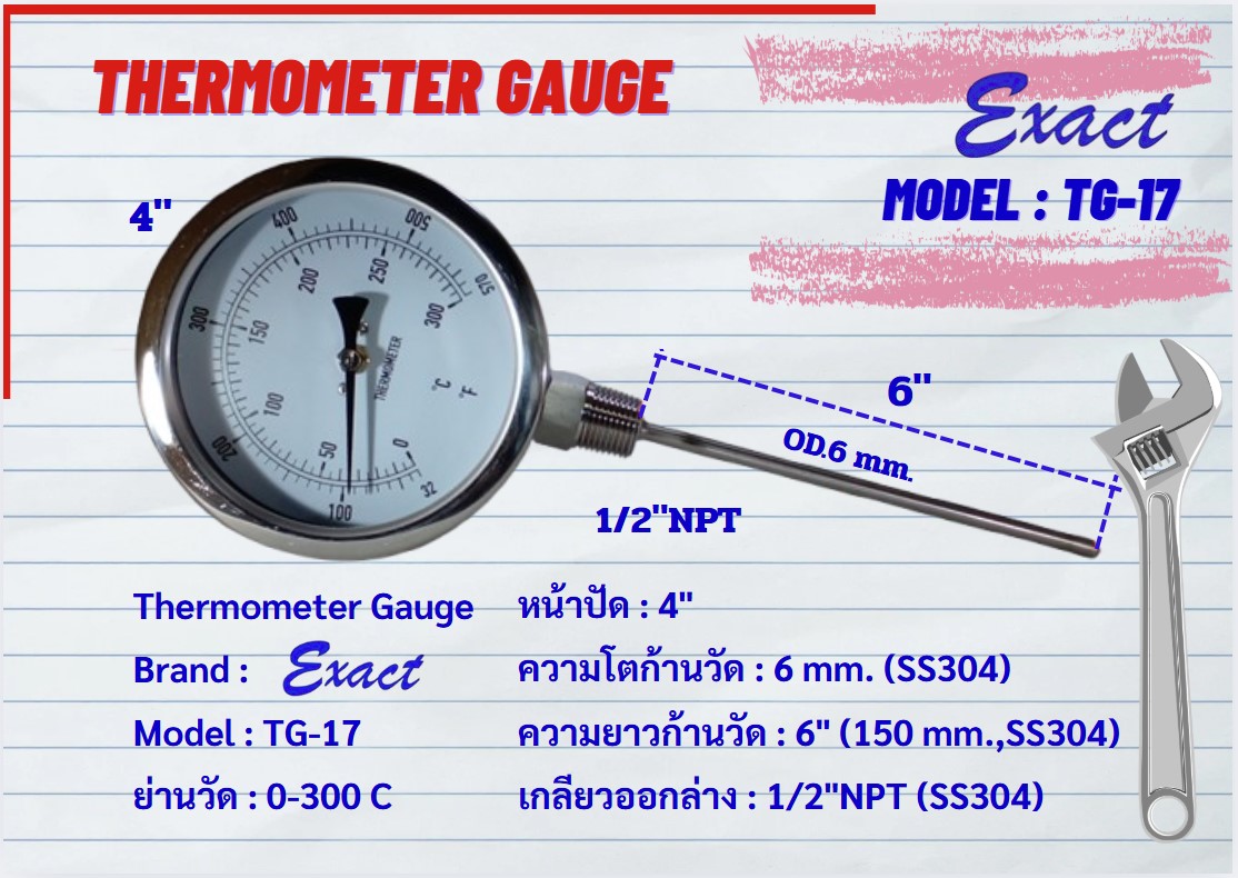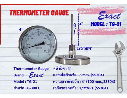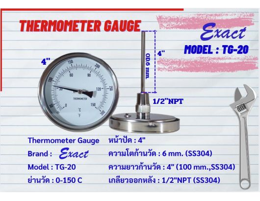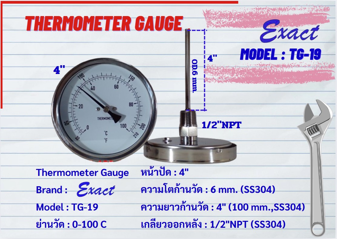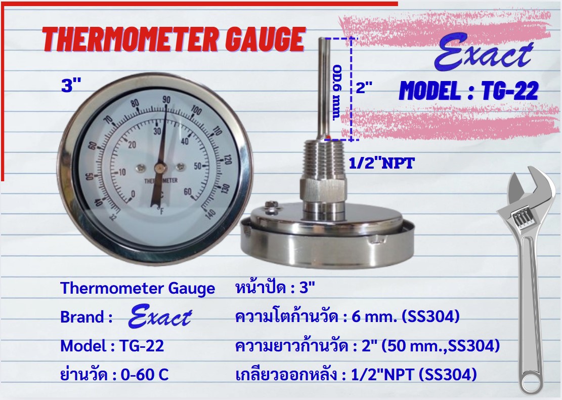 ขนาดหน้าปัด 3”, 4” มีทั้งแบบเกลียวออกหลังและแบบเกลียวออกล่าง ขนาดเกลียว ½” NPT สแตนเลส ความโตของก้านวัดมีขนาด 6 mm. ยาว 2”, 4”