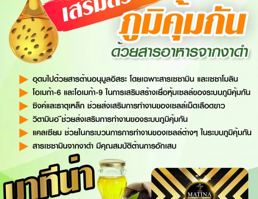 มาทีน่า แบล็คเซซามิน น้ำมันงาดำสกัดเย็น 100% อุดมไปด้วยวิตามิน และแร่ธาตุที่จำเป็นต่อร่างกายมากมาย เช่น วิตามินบี1 วิตามินบี2 วิตามินบี3 วิตามินบี5 วิตามินบี6 วิตามินบี9 แมกนีเซียม โซเดียม ฟอสฟอรัส สังกะสี เหล็ก แคลเซียม มีส่วนช่วยบำรุงส่วนต่างๆของร่างกาย